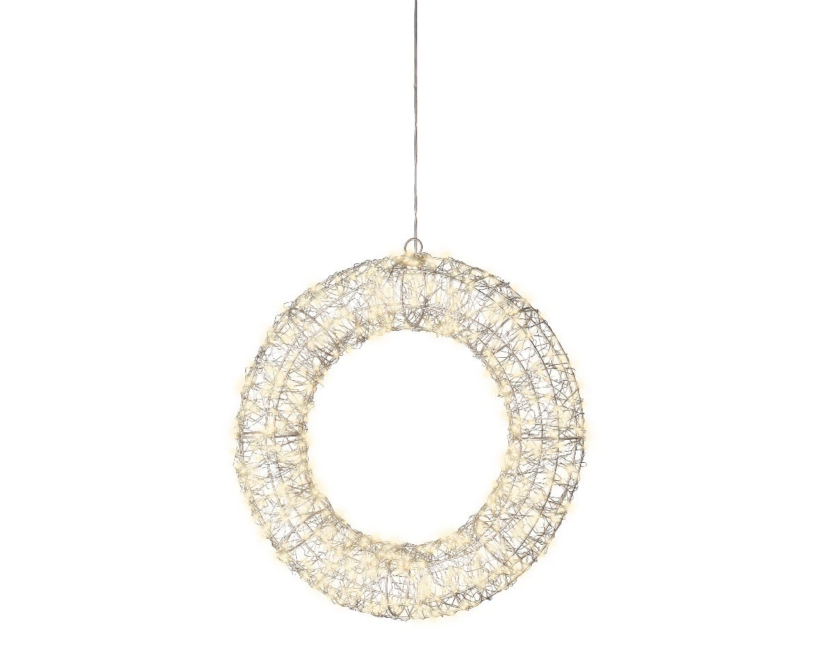 Refined and radiant, this silver wreath brings a gentle brilliance to any setting. Designed with delicate silver wire and filled with warm white micro LED lights, it glows with a soft, ethereal light that feels both modern and timeless. A coordinating silver cable offers a seamless, elegant presentation. Wherever displayed, this luminous wreath adds a festive shimmer that transforms your space with holiday charm.