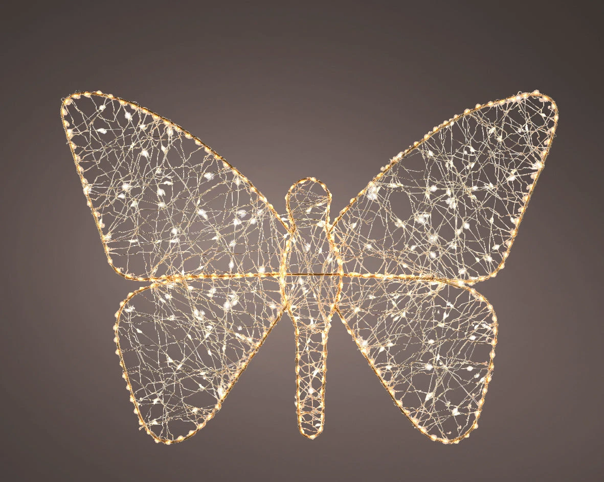 This radiant gold butterfly captures the eye with its intricate silhouette, illuminated by classic warm micro LED lights delicately strung along sleek silver wire. A soft flashing effect mimics the subtle flutter of wings, adding a sense of gentle movement to its graceful form. Designed to dazzle in any environment, it brings a touch of whimsical brilliance whether glowing indoors or displayed as an enchanting highlight outdoors.