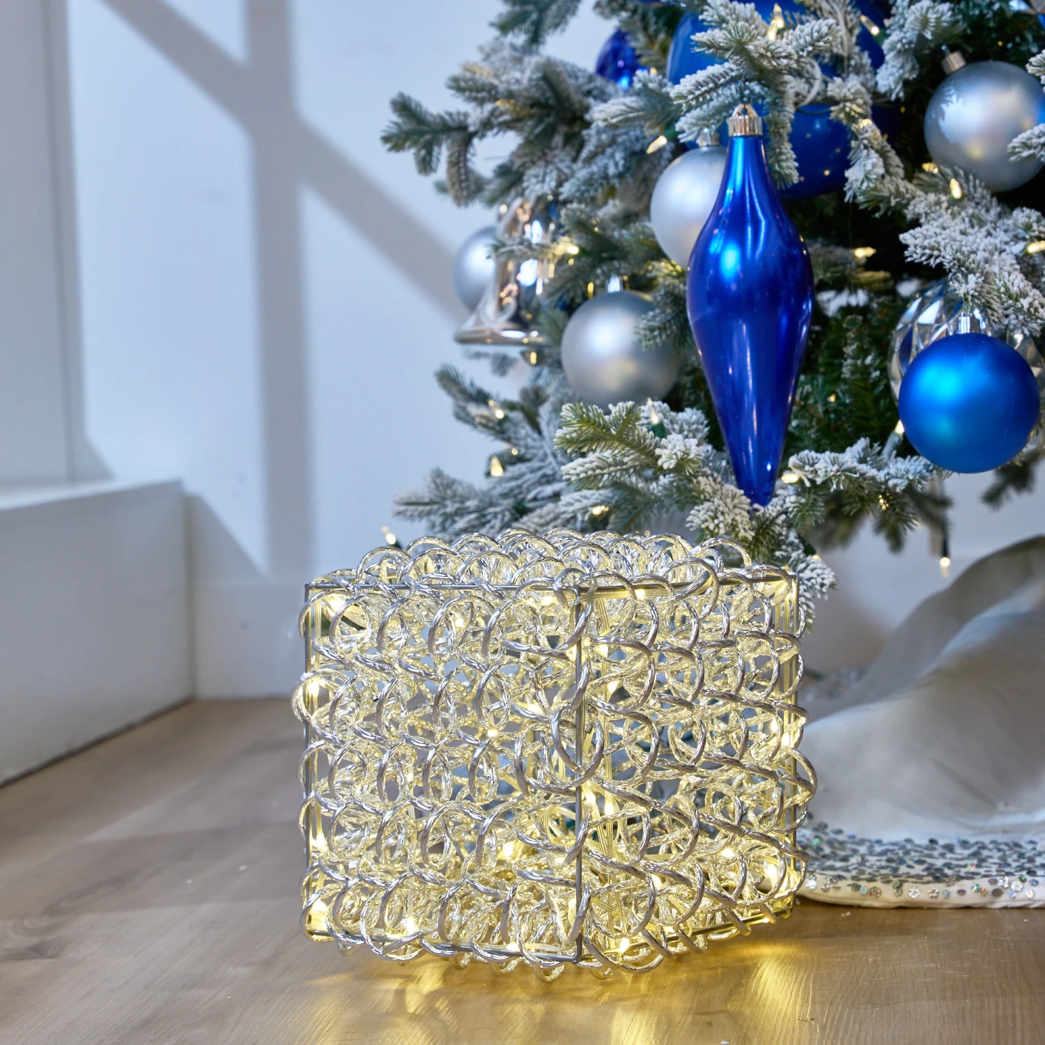 Shimmering with radiant elegance, this 11 inch silver cube glows with 100 warm white LEDs nestled within a beautifully sculpted metallic frame. Its intricate design sparkles with light, adding a touch of modern charm and holiday magic to any display. Perfect for tabletops, under the tree, or brightening a cozy corner with a soft, golden glow.