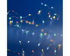 A playful cascade of color shines from 60 micro LEDs along 10 feet of slender silver wire, bringing joyful energy to your indoor décor. These energy-efficient lights are battery operated and offer an impressive battery life, making decorating effortless and long-lasting. Perfect for brightening small spaces with vibrant charm and a touch of holiday magic.