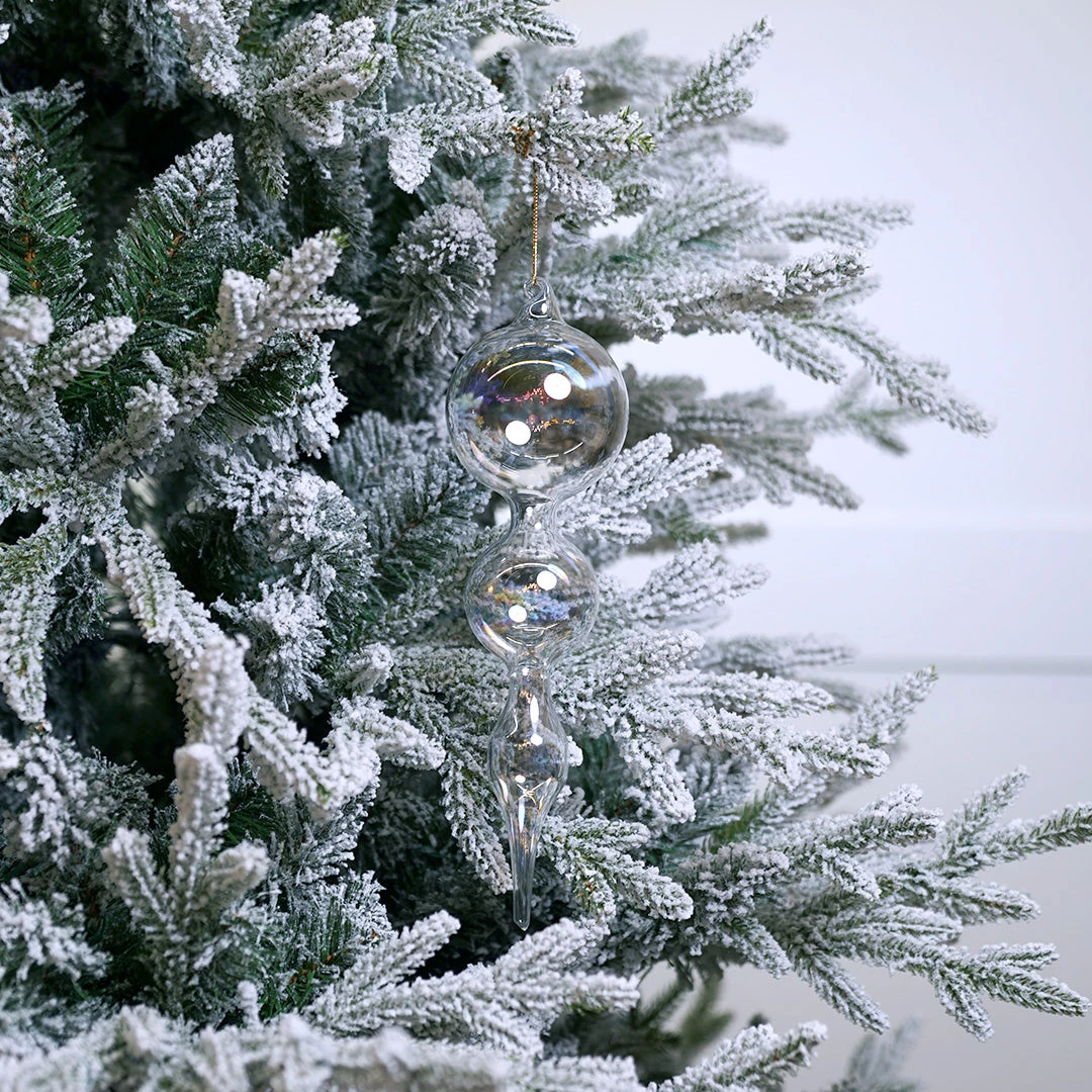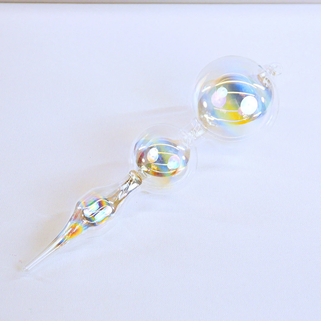 This iridescent clear bubblegum finial from Jim Marvin is a breathtaking work of art, hand-blown with exceptional craftsmanship. Featuring three varying-sized bulbs, each with a smooth, glossy finish that reflects the light in a mesmerizing way, this ornament is a true stunner. Its delicate, iridescent shimmer adds a touch of sophistication and elegance to any décor, making it a versatile piece that complements both traditional and modern settings. Whether displayed on your Christmas tree, as part of a festive arrangement, or as a standalone accent, this vibrant finial will be a standout addition to your collection, radiating timeless beauty and charm for years to come.