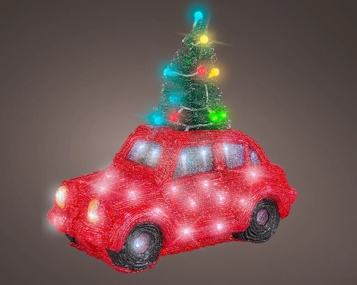 Bring home the joy of the season with this festive red acrylic car, topped with a dazzling Christmas tree and glowing with 80 cool white LED lights. Bursting with holiday charm, this delightful piece sparkles with personality and is crafted from durable acrylic for lasting use year after year. Perfect for both indoor and outdoor displays, it features a built-in timer for effortless, twinkling magic that lights up your décor with cheerful spirit.