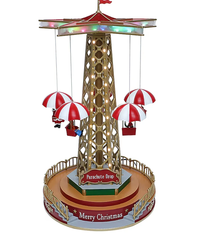 Bring festive motion and nostalgic fun to your holiday décor with this charming carnival ride display. Designed to resemble a vintage amusement park parachute drop, it features a tall, glittering tower with candy-striped parachutes that gently twirl and sway. A “Merry Christmas” banner at the base completes the joyful scene, perfect for playful and elegant displays alike.