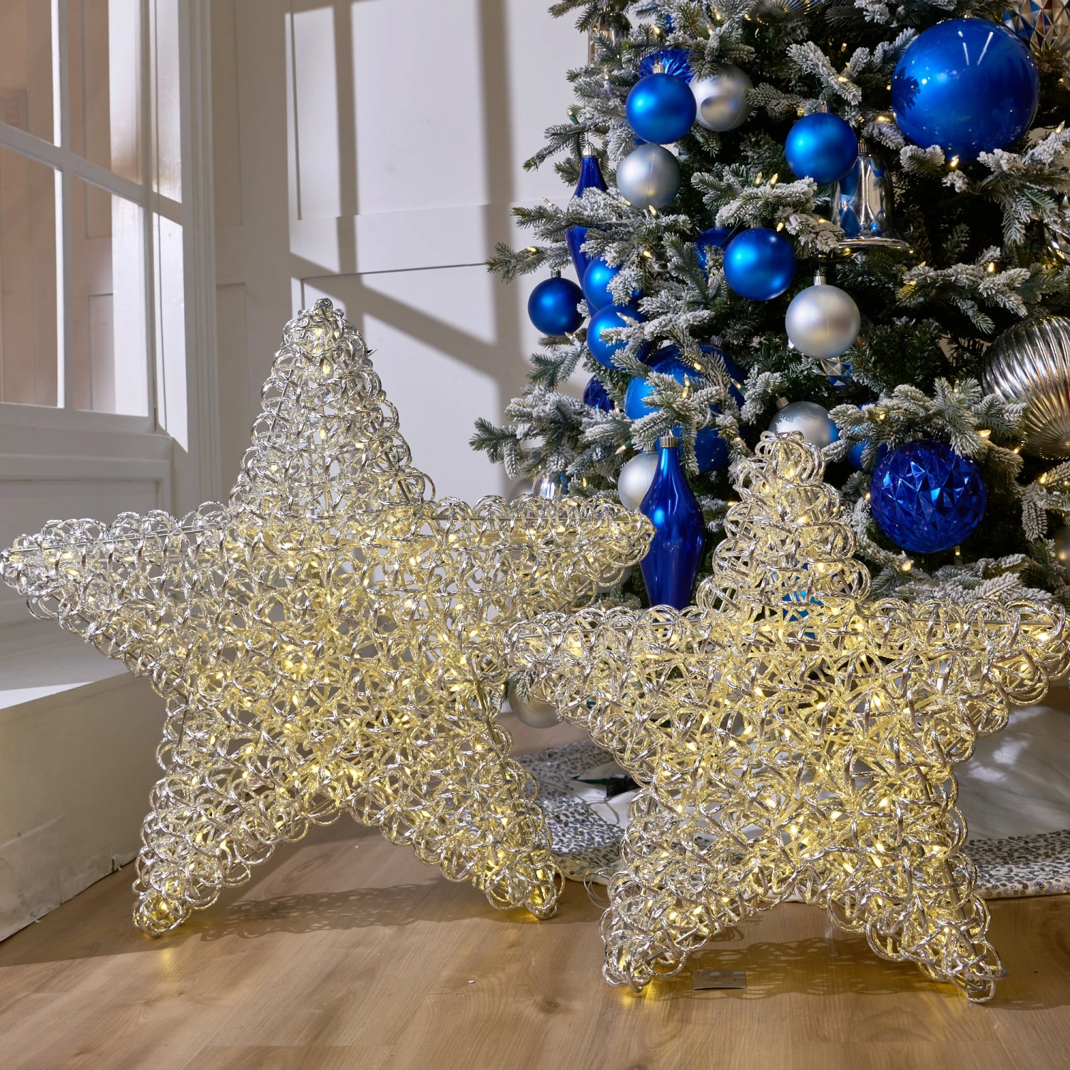 Illuminate your holiday space with the radiant charm of this 24 inch silver star, glowing with 100 warm white LEDs delicately woven into its shimmering silver frame. Designed to dazzle, it casts a soft, golden light that adds warmth and enchantment to any room. A brilliant accent that captures the spirit of the season with timeless sparkle.