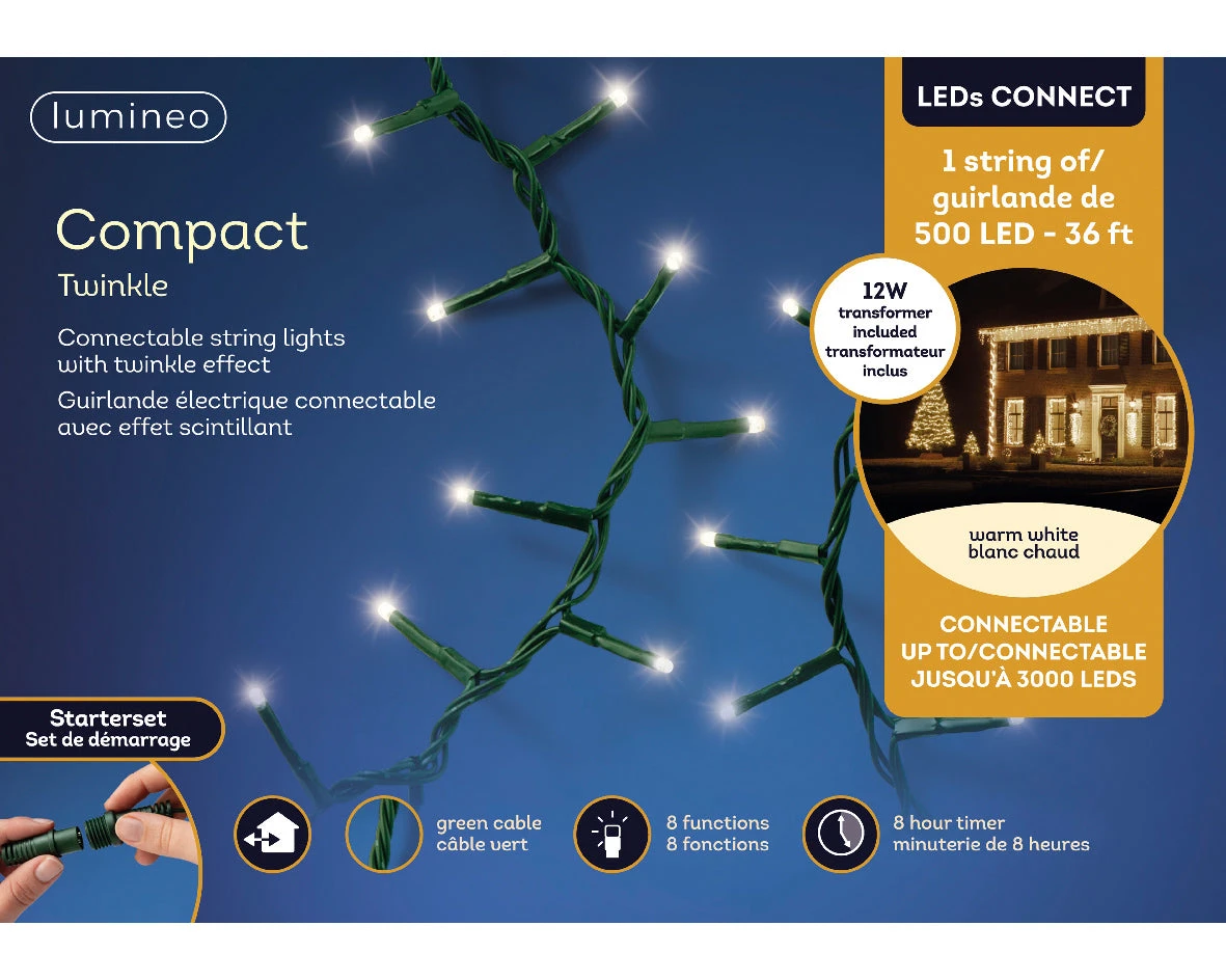 Create a warm and welcoming glow with this 36-foot compact starter set featuring 500 warm white 3mm LED lights. Perfect for both indoor and outdoor decorating, the soft golden light sparkles along a classic green wire, adding charm and elegance to any space. With multiple twinkle functions and a built-in timer, this energy-efficient set offers effortless holiday cheer that lasts all season long.