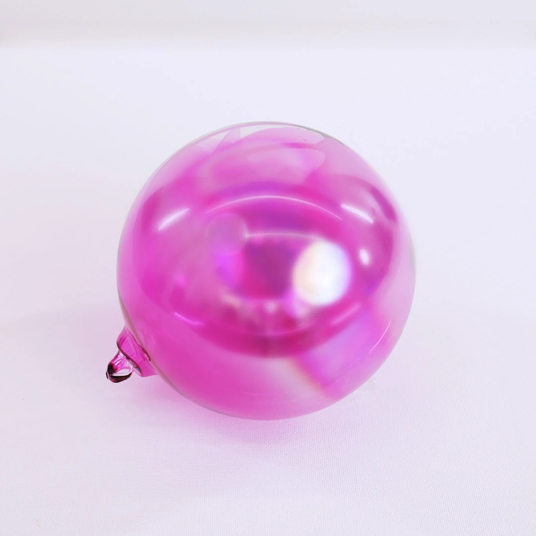 This glossy Jim Marvin fuchsia bottle glass ball is a stunning decorative piece that effortlessly draws the eye. The vibrant fuchsia hue, with its radiant and luminous glow, exudes elegance and sophistication. Its bold, alluring color commands attention, adding a striking pop to any setting.