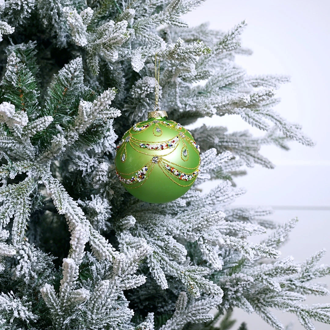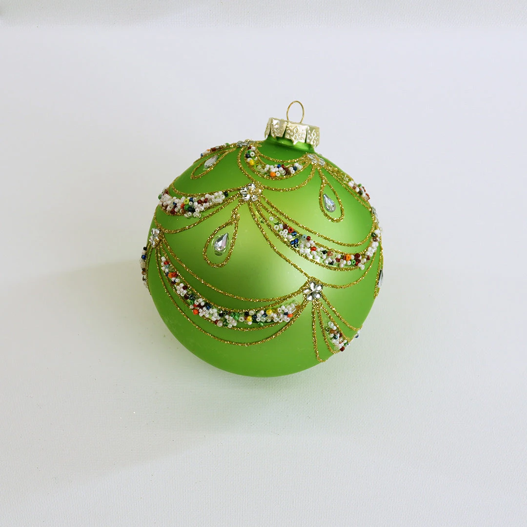 The Jim Marvin vibrant, green matte beaded swag glass ball ornament is a stunning piece of artistry that effortlessly combines intricate craftsmanship with bold elegance. Adorned with an array of meticulously arranged multicolor beads, this exquisite ornament creates a captivating design full of life and color. Accentuated by shimmering gold glitter, it radiates warmth and sophistication, making it the perfect addition to your holiday décor. A perfect fusion of vibrant green and intricate detailing, this ornament is sure to be a striking and eye-catching centerpiece in any space.
