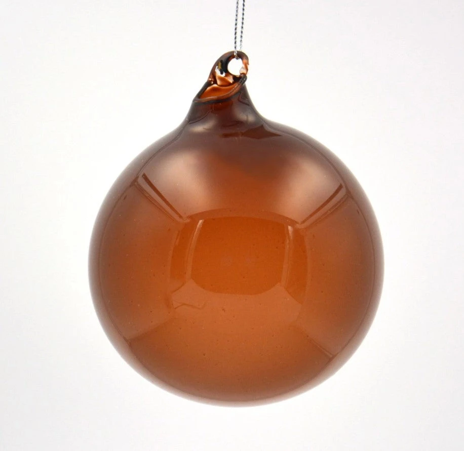 Add a warm and sophisticated feel to your holiday décor with the chocolate brown glass ball ornament by Jim Marvin. Its rich, deep brown hue brings a sense of coziness and elegance to any space, making it a striking addition to your home. This beautiful hand-blown ornament reflects the light beautifully, creating a warm, inviting glow. With its timeless design and classic color, it’s sure to bring a touch of refined charm and festive cheer to your celebrations.
