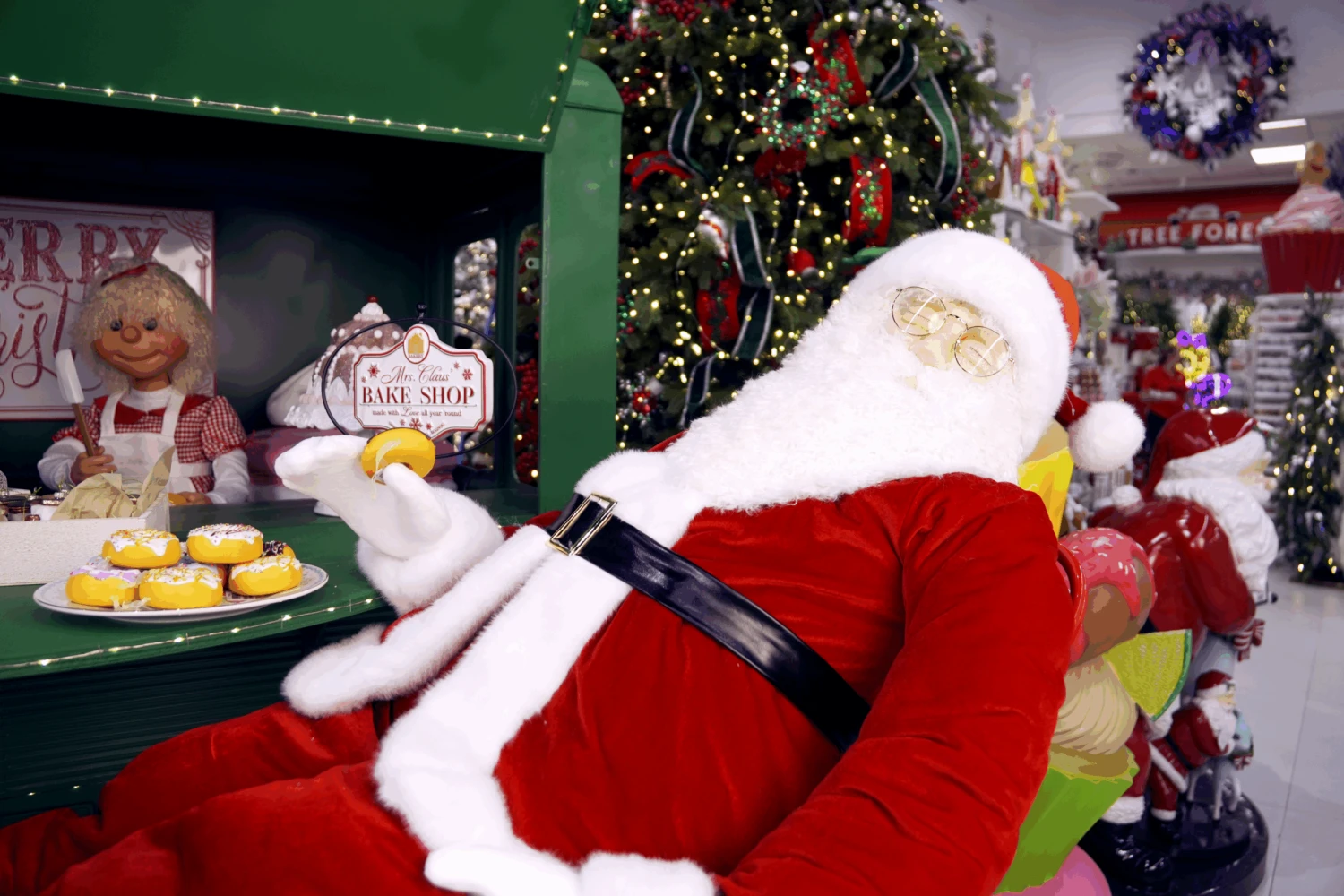 Perfect for creating a memorable holiday scene, this oversized Santa pairs beautifully with bakery or workshop displays, giving the impression that he’s sneaking a little rest between holiday treats.