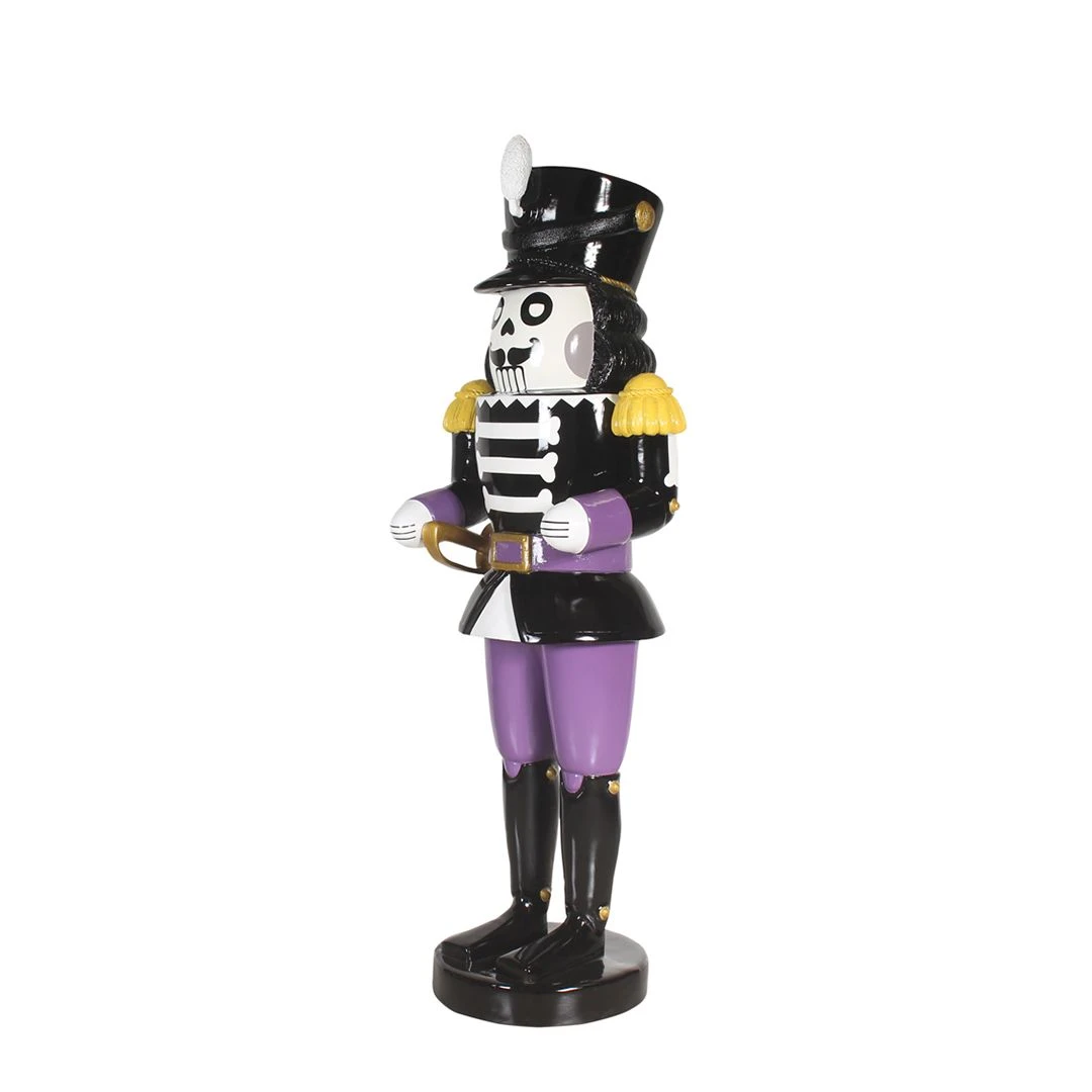Command attention this Halloween with our striking 6-foot Spooky Nutcracker, expertly crafted from durable fiberglass resin for both indoor and covered outdoor display. This unique decorative piece puts a haunting twist on the classic holiday nutcracker, featuring a skeletal face, black military-style uniform with white bone accents, and bold purple trousers.