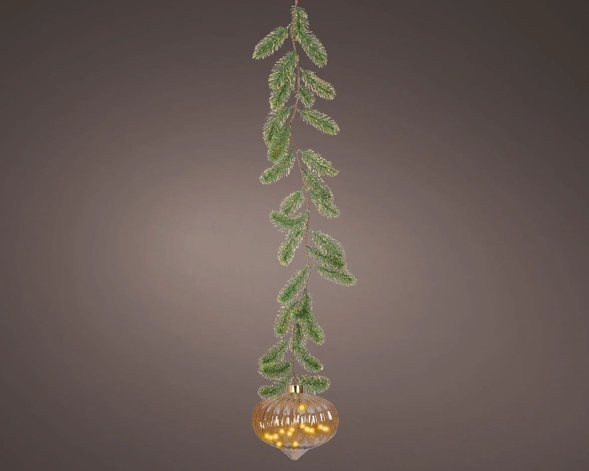 Graceful and glowing, this sheer amber onion ornament brings a touch of warmth and elegance to any holiday setting. Softly illuminated from within by 15 classic warm micro LED lights on a delicate copper wire, it casts a gentle, golden light that enhances its sculpted silhouette. Battery operated with a built-in timer for effortless daily lighting, this ornament offers a beautiful blend of cozy radiance and seasonal charm. For Indoor Use.