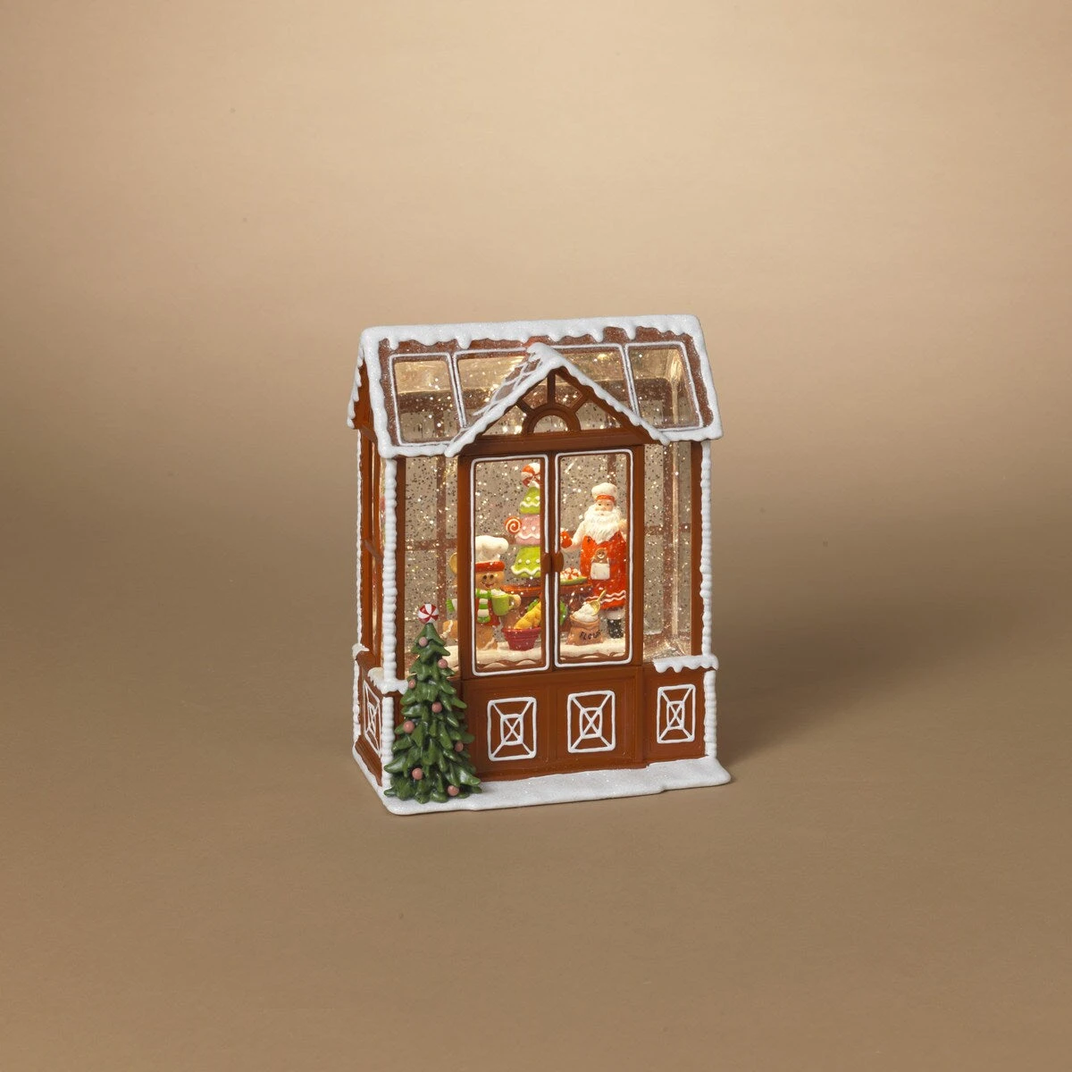 Bring the magic of a cozy winter’s night to your décor with this charming glass-front display. Peering through frosty windows, you’ll spot Santa inside surrounded by colorful presents and warm light. With snow-dusted edges, brick-like walls, and a pine tree tucked beside the door, this miniature setting evokes the nostalgia of holiday shopfronts and small-town charm.