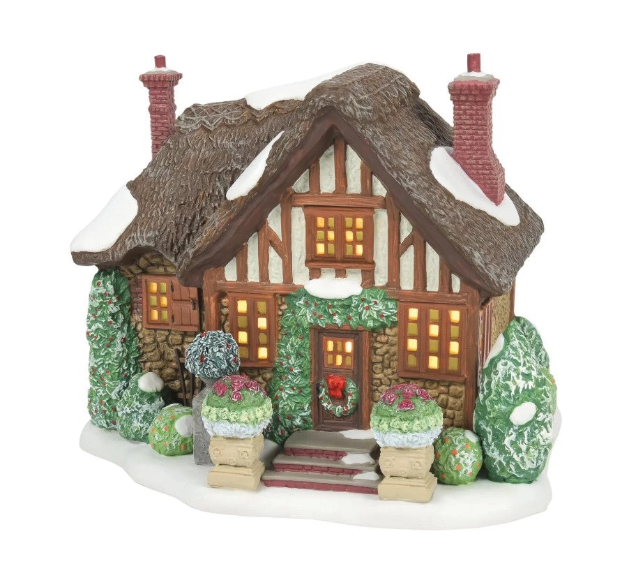 Nestled within a serene winter landscape, Lord Lilliput’s cottage is the very essence of classic English countryside charm. With its snow-kissed thatched roof, timbered façade, and warmly glowing windows, this stately yet inviting retreat reflects the quiet grace and timeless tradition of its distinguished resident. Trimmed in lush garlands and flanked by manicured topiaries, it’s a picture-perfect home for a noble spirit who appreciates elegance, warmth, and holiday cheer.
