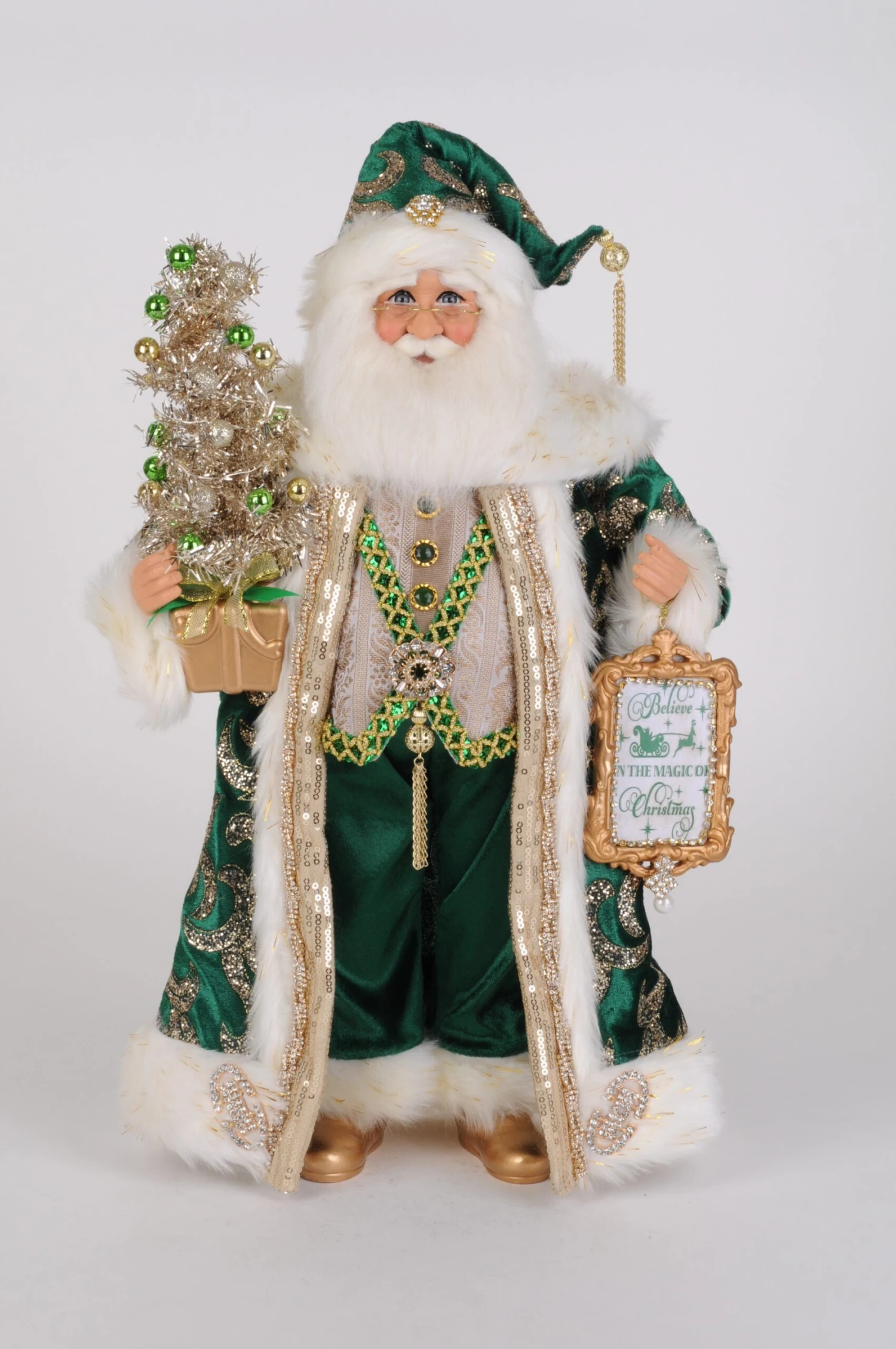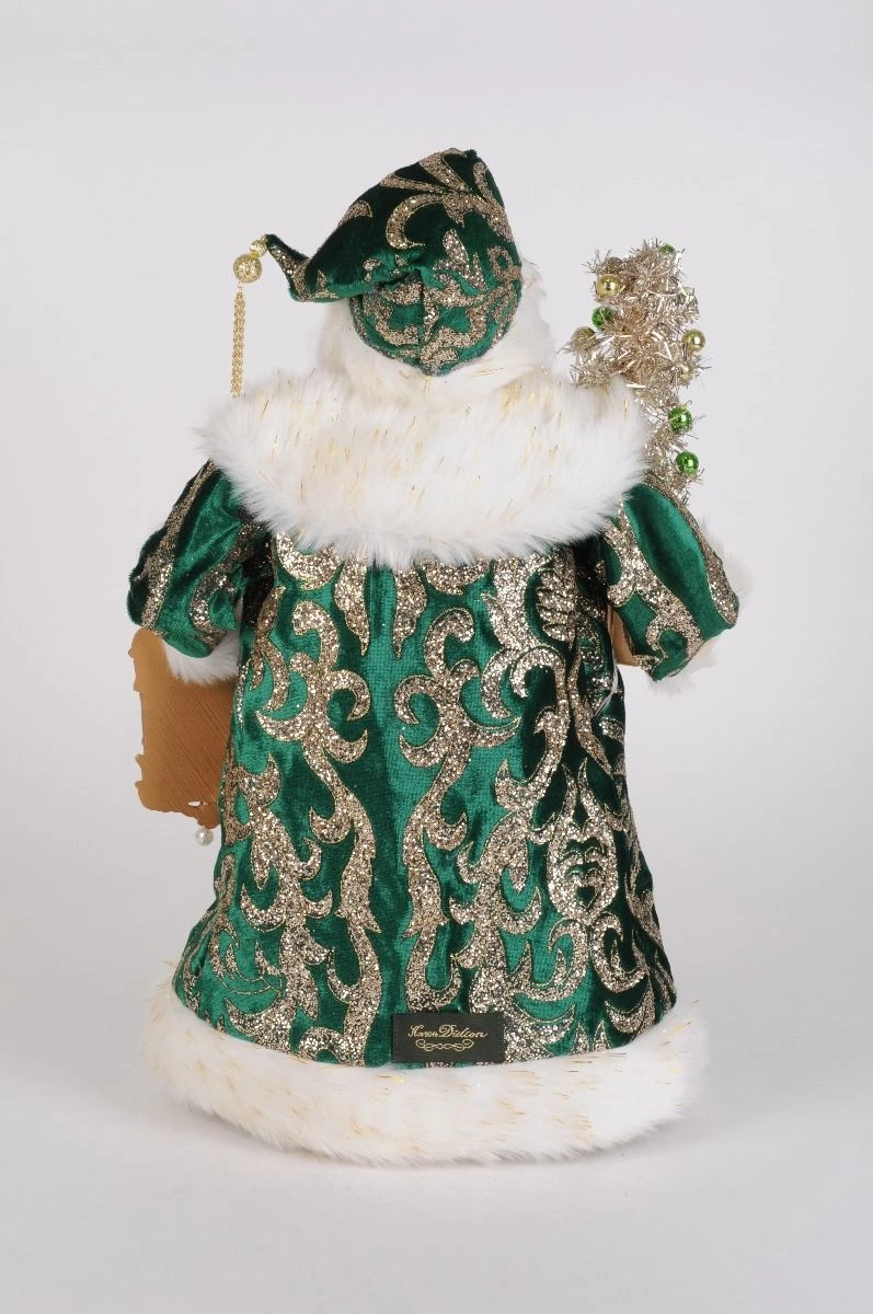 Karen Didions Jade Elegance Santa is great for any shelf, mantle, and countertop. The quality is unmatched with this decorative piece’s hand-painted face, inset eyes, unique fabric, and detailed accessories. With this design’s luxurious touch, beautifully lit tree, and jeweled embellishments; he’s sure to add some shimmer and shine to any home. Lights are battery operated.