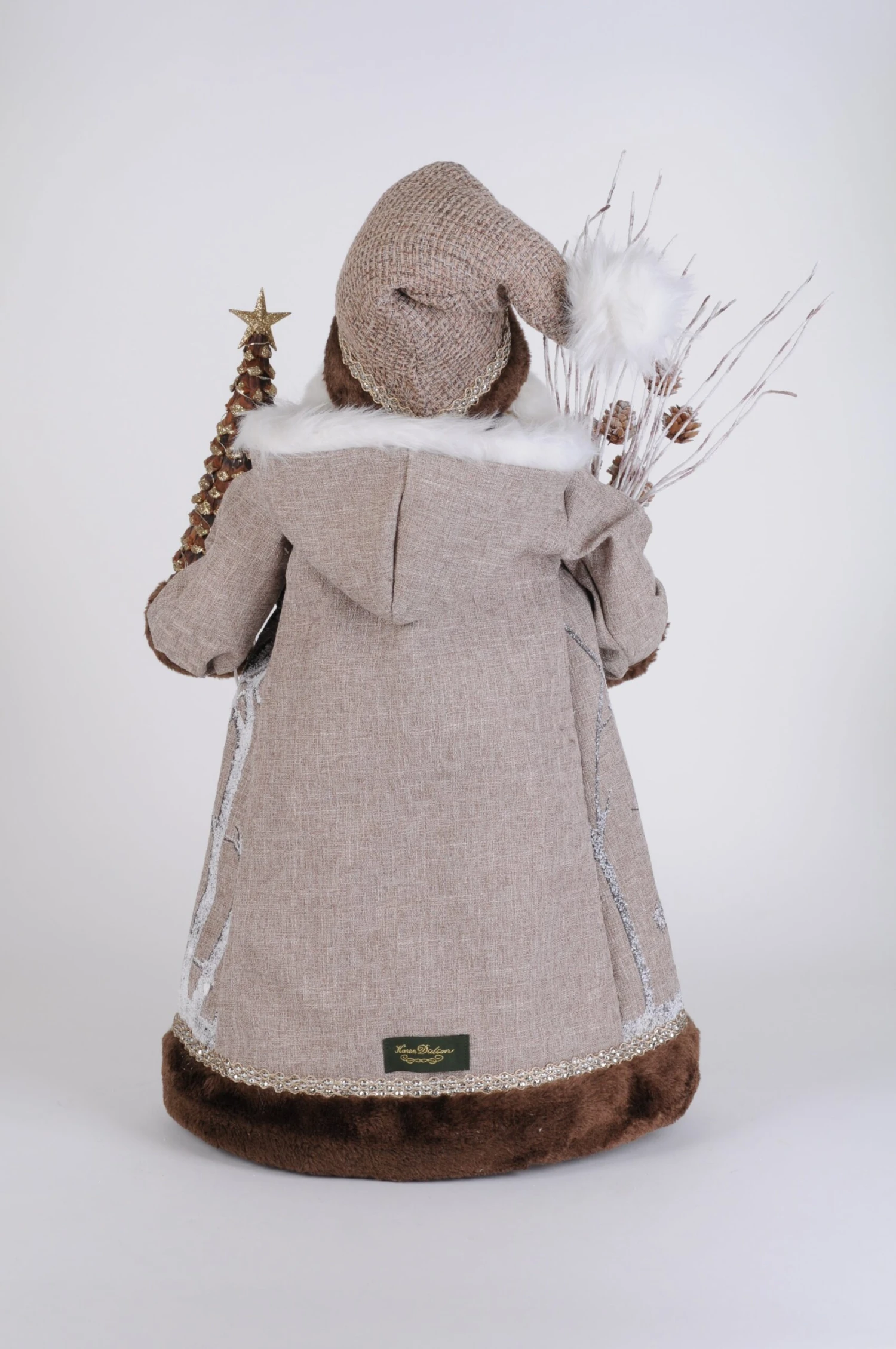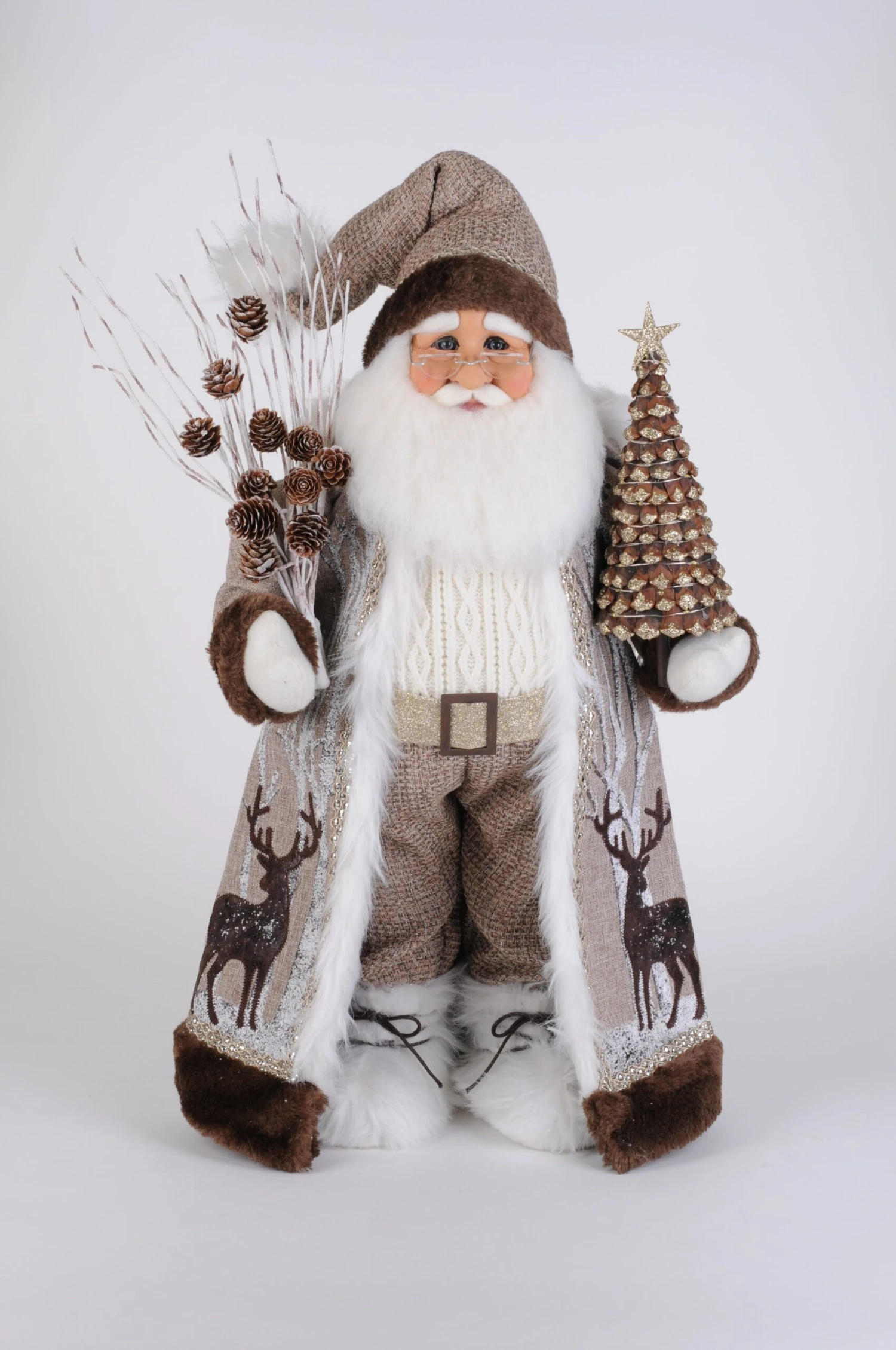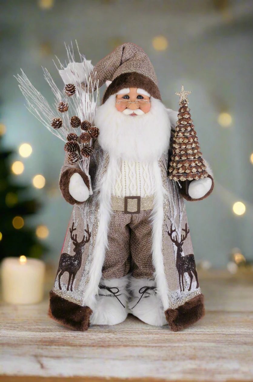 The Lighted Winter Woods Santa is great for any shelf, mantle, and countertop. The quality is unmatched with this decorative piece’s hand-painted face, inset eyes, unique fabric, and detailed accessories. With his beautifully lit pinecone tree, woodland appearance, outdoor themed accessories, and warm design; this Christmas piece is sure to add character and style to any home or cabin. Lights are battery operated.