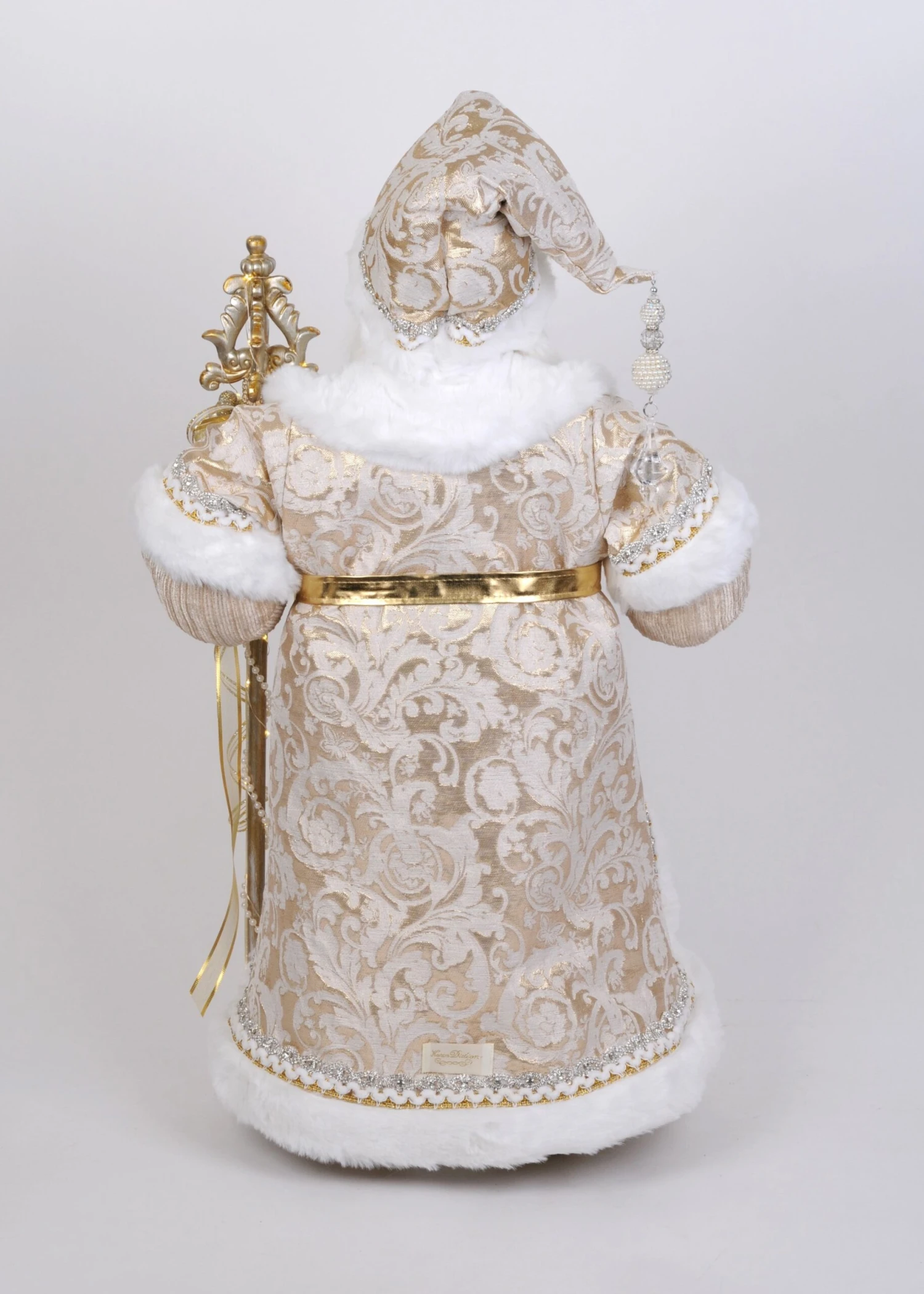 Elevate your holiday décor with Karen Didion’s Gold Couture Santa. Cloaked in a luxurious, finely detailed coat, this handcrafted collectible exudes grace and elegance. He holds a majestic staff adorned with pearls and flowing gold mesh ribbons, adding a touch of grandeur. Sparkling gems accent his ensemble, while his hat is embellished with delicate pearled and clear gems that dangle beautifully, completing his sophisticated look. With a hand-painted face, lifelike inset eyes, and exquisite fabric details, this Santa is a stunning centerpiece for any festive display.