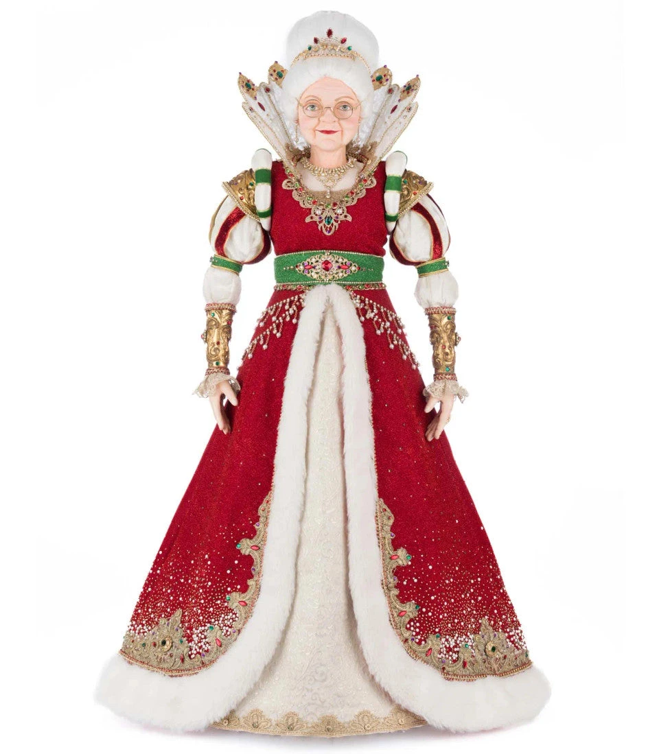 Introducing Queen Noelle Claus from Katherine’s Collection, a regal and enchanting figure of the North Pole that radiates elegance and festive charm. Draped in a luxurious long red dress coat, lined with soft, pristine white fur, she embodies the spirit of the season with grace and poise. Her stunning red dress adorned with delicate gold accents, enhance her royal presence. Atop her head, she wears a shimmering tiara, adorned with red and green gems, adding a touch of brilliance and holiday sparkle. Queen Noelle Claus is a sophisticated and captivating addition to any décor, bringing an elegant, festive touch that will surely elevate your holiday celebrations.