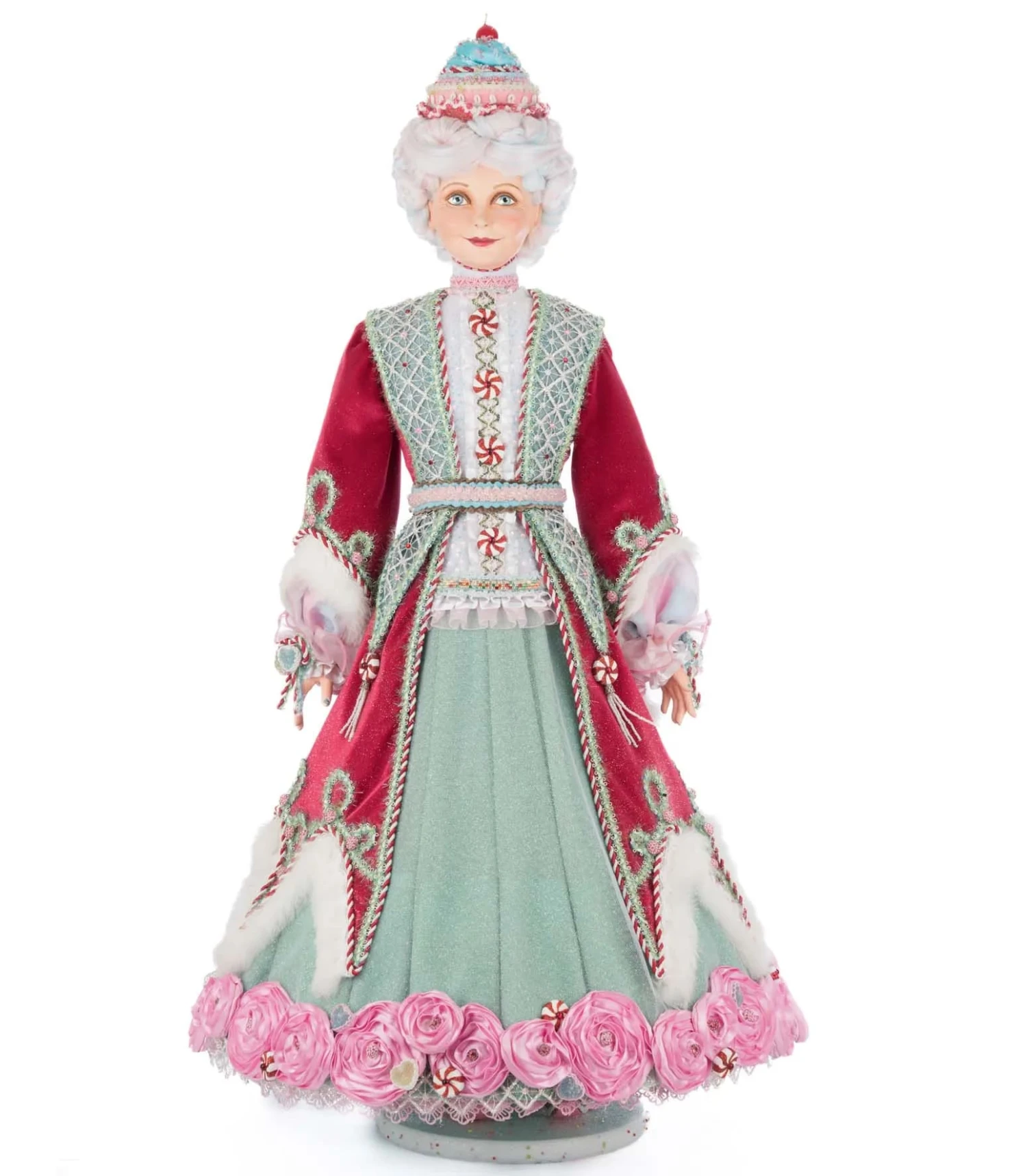 Introducing the Katherine’s Collection Kandi Kringleberry, a delightful and whimsical holiday figure that brings a touch of sweetness to any décor. Dressed in a charming long red coat adorned with scrumptious swirls and tiny peppermints, her coat is lined with soft white fur, adding a luxurious touch to her festive ensemble. Her curly pastel blue hair, almost white, radiates a soft, dreamy quality that complements her joyful spirit. Perched atop her head is a playful pink and blue cake, topped with a vibrant red cherry, completing her sweet and whimsical look. Kandi Kringleberry is sure to sweeten up your holiday celebrations, making her a must-have addition to any décor that needs a sprinkle of holiday cheer.