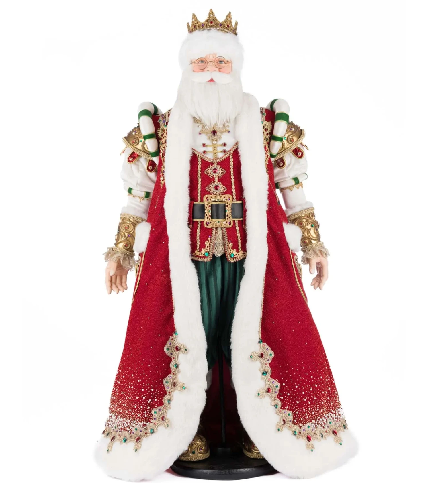 Introducing King Christian Claus from Katherine’s Collection, a regal and enchanting figure of the North Pole that brings a touch of royal elegance to your holiday decor. Draped in a luxurious long red coat, lined with soft, pristine white fur, he exudes an air of sophistication. His emerald green trousers and stunning red vest, adorned with intricate gold accents, add to his grandeur. Atop his head rests a majestic gold crown, embellished with shimmering pearls and gems, making him the perfect symbol of holiday nobility. King Christian Claus is more than just a decoration; he’s an elegant and charming centerpiece that will bring a royal touch of festive magic to your home.