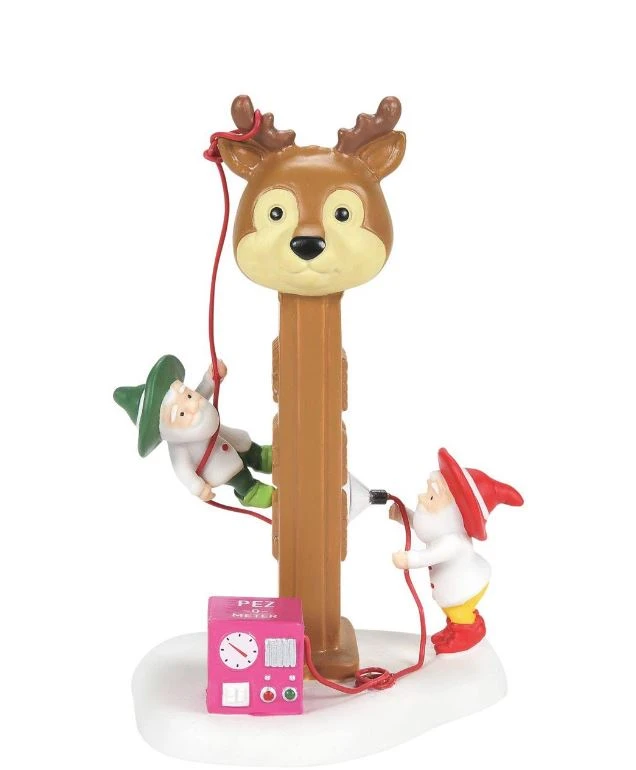 The tower is a tall brown PEZ dispenser with an adorable reindeer face at the top! One elf is scaling the tower while the other ensures it is in tip top shape!