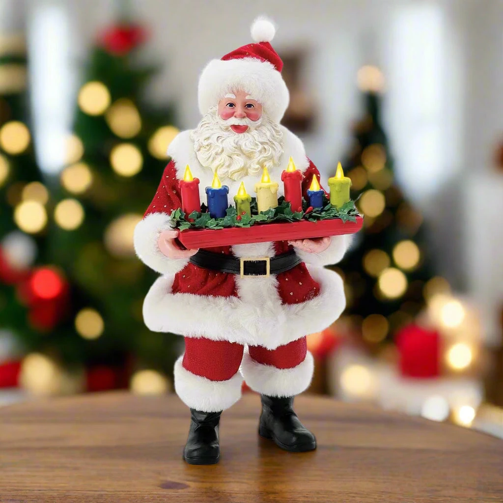 Santa dressed in his classic red suit and black boots, his coat and hat sparkle with shimmering gems. In his hands, he holds a festive red tray adorned with holly leaves, showcasing seven candles in an array of colors and varying heights. The candles illuminate with warm LED lights, bringing a cozy glow to your holiday décor. Designed by U.S. artist Ann Dezendorf and crafted with signature Clothtique fabric, this piece is a true holiday treasure.