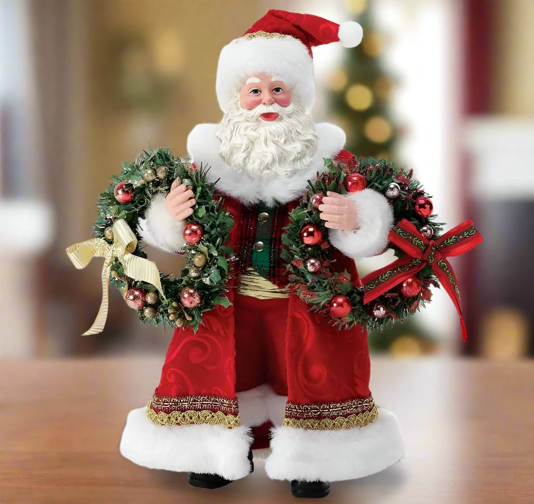 Santa is spreading double the holiday cheer! Wearing his classic red suit with a magnificent red overcoat, all lined in soft white faux fur, he exudes festive elegance. In each arm, he holds a beautifully adorned wreath—one with a sophisticated gold bow and the other with a timeless red bow, ready to deck the halls in style. Crafted with signature stiffened fabric and hand-painted details, this exquisite piece is part of the Department 56 Possible Dreams Collection, making it a perfect addition to any holiday display.