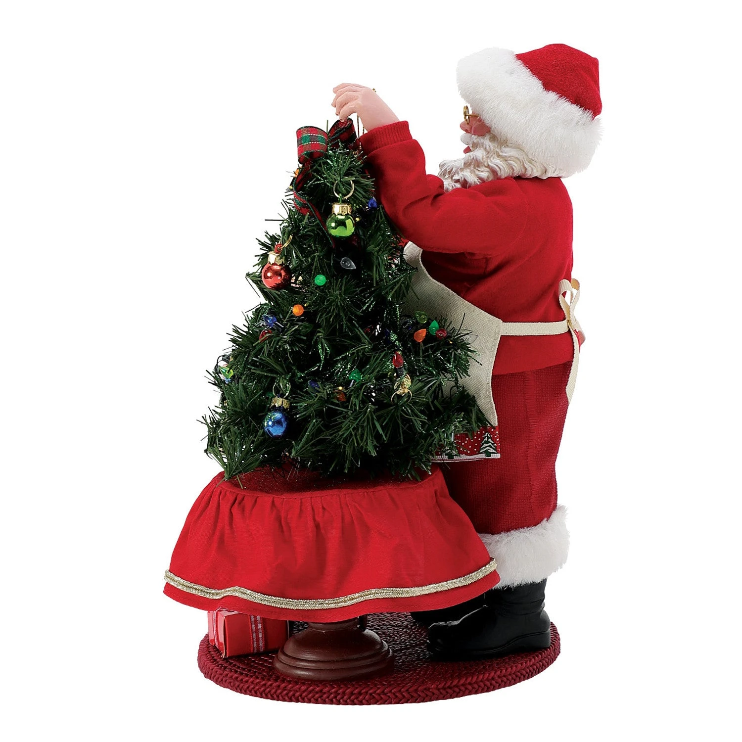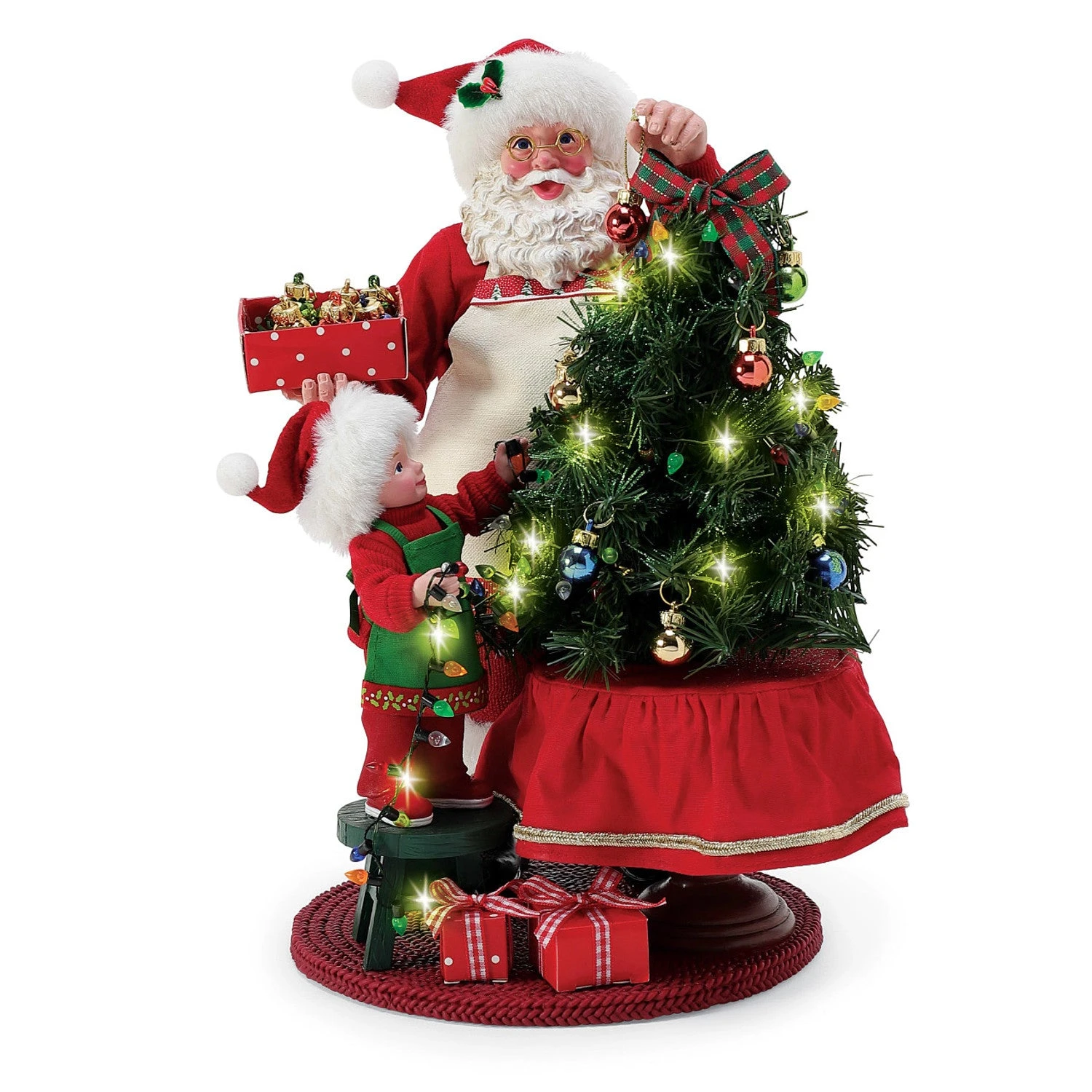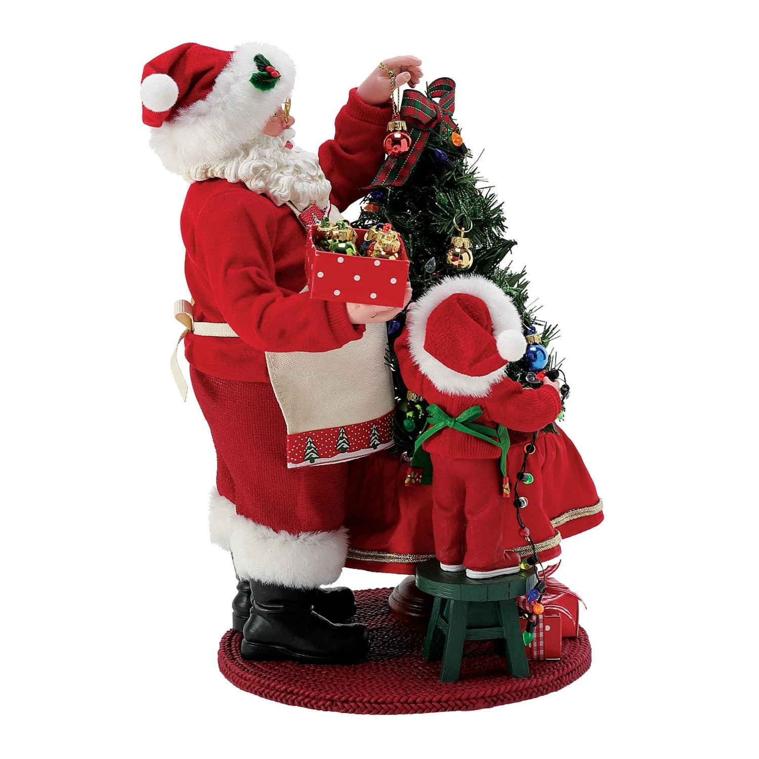 Santa and his happy helper add the final touches to their beautifully decorated Christmas tree, making sure it’s the best one yet! Adorned with colorful mini ornaments, a lovely red skirt, and twinkling LED lights, the tree glows with warm holiday cheer. Crafted from signature stiffened Clothtique fabric with hand-painted details, this heartwarming piece is a festive addition to any holiday display!
