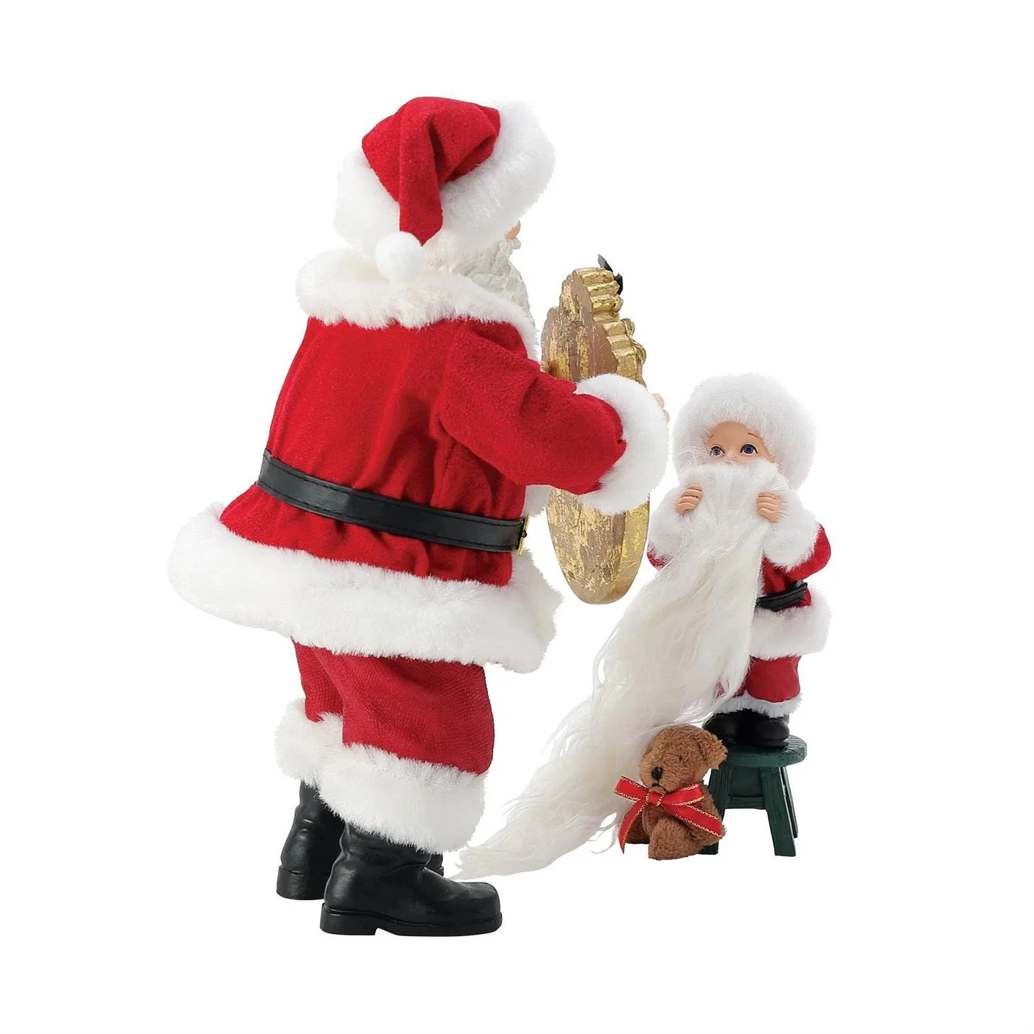 Standing tall and proud in his classic red suit, Santa holds a gold-framed mirror in front of a young believer, who playfully holds a long white beard to his face. Standing on a little green stool, the child gazes into the mirror, seeing more than just a reflection—he sees the magic and spirit of Christmas come to life. Crafted from signature stiffened Clothtique fabric with hand-painted details, this heartwarming piece is a beautiful reminder to always believe!