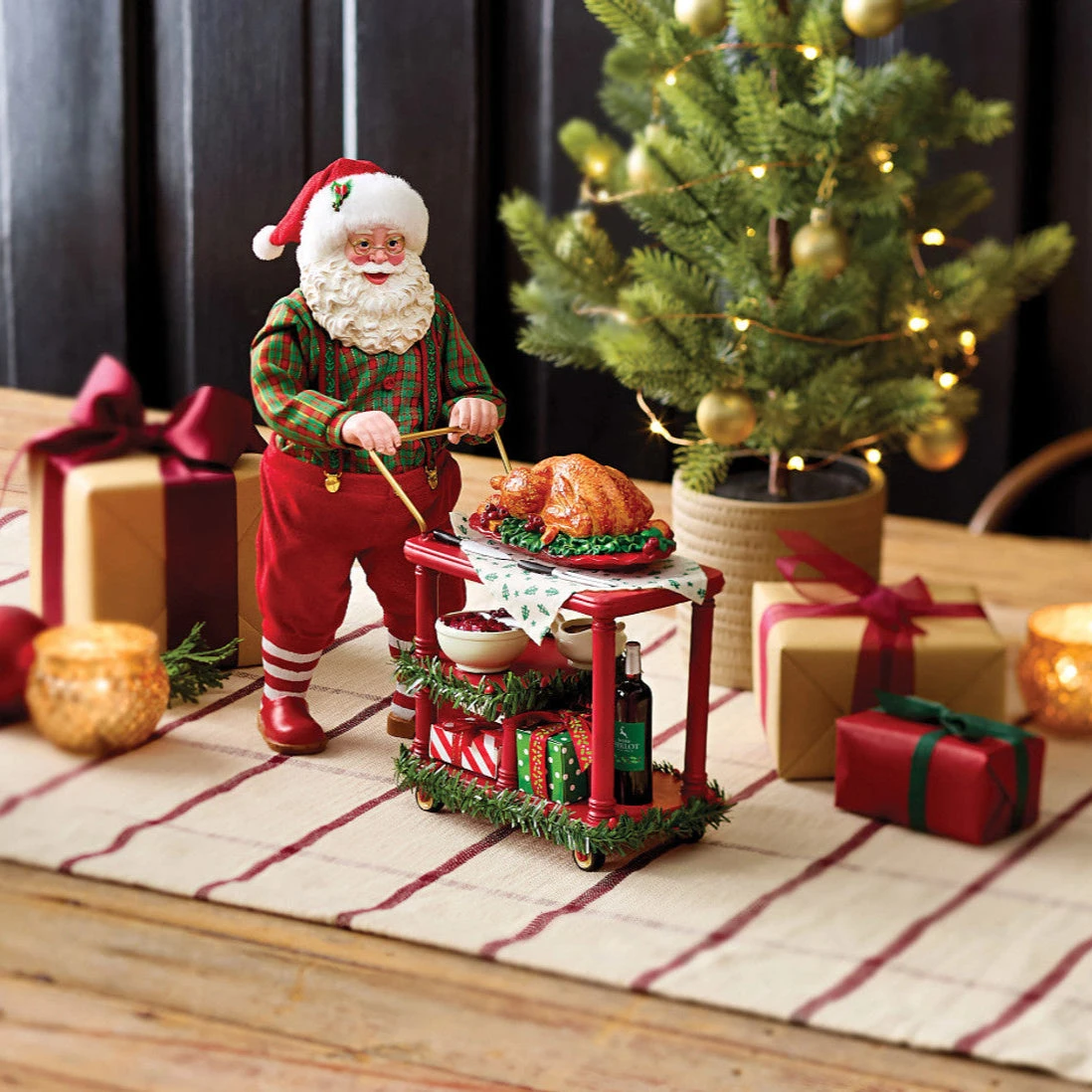 Santa truly delivers the holiday spirit! Dressed in his finest, he pushes a cart featuring the star of the feast—a perfectly roasted turkey that looks absolutely mouthwatering. Alongside it, you’ll find all the festive trimmings, including cranberries, rich gravy, and a fine bottle of wine. The bottom shelf of the cart is filled with beautifully wrapped gifts, making this a celebration to remember.