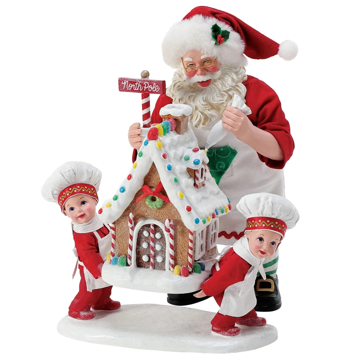 Santa is busy adding the sweetest touch to Christmas as he decorates a delicious gingerbread house with his two joyful helpers! Dressed in matching red attire, white aprons, and chef hats, the little bakers happily carry the gingerbread with festive cheer. This adorable collectible is sure to sweeten any décor, crafted with stiffened fabric and hand-painted details as part of the Department 56 Possible Dreams Collection.