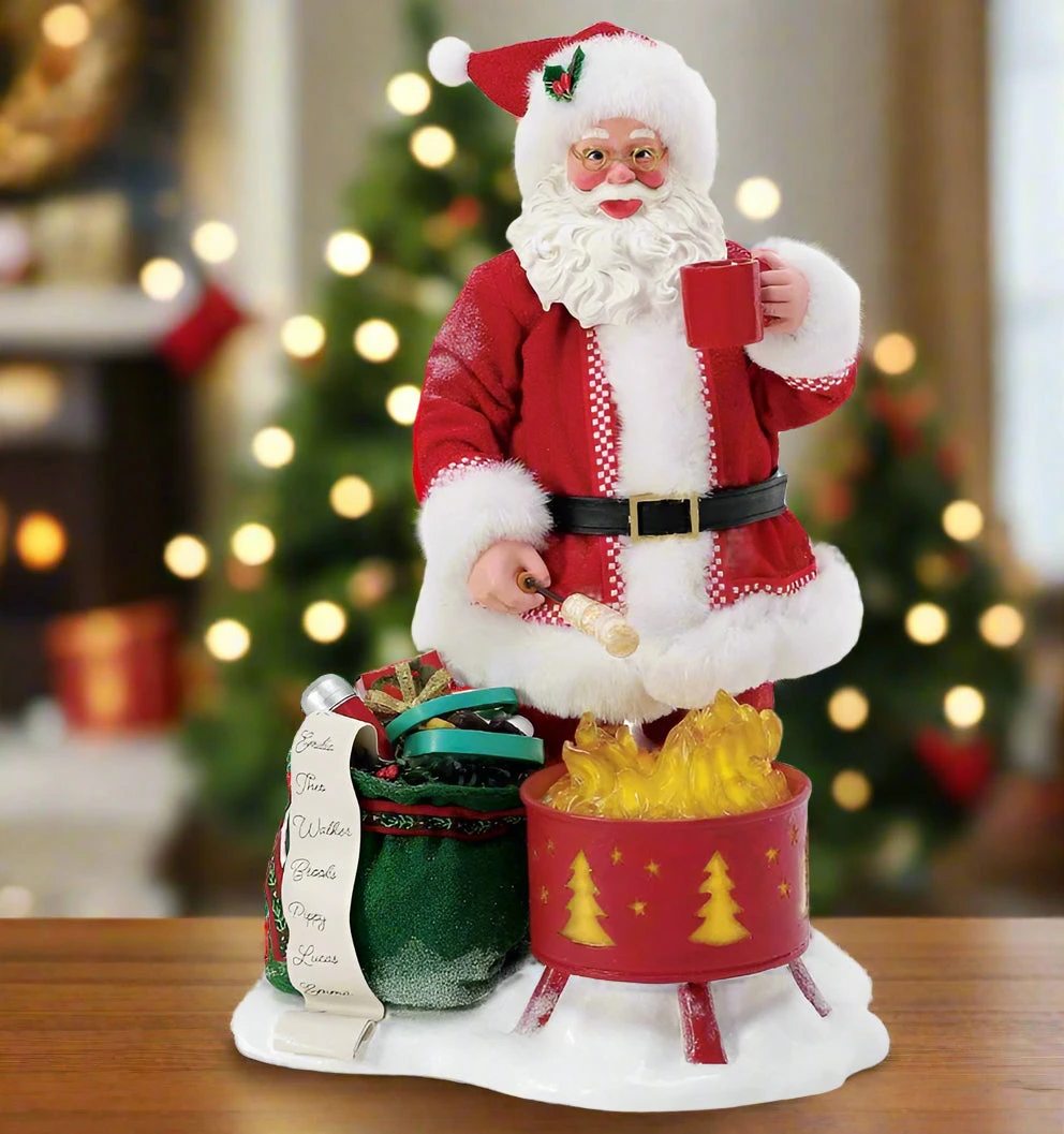 Warm up the holidays with this Santa, standing on a snowy patch in his classic red suit beside an overflowing sack of gifts and a list of good boys and girls. Santa stays cozy over a glowing fire, roasting marshmallows on a stick while sipping hot chocolate from his red mug. Crafted with signature stiffened Clothtique fabric and hand-painted with intricate details, this festive scene is designed by U.S. artist Ann Dezendorf—a perfect addition to your holiday décor!
