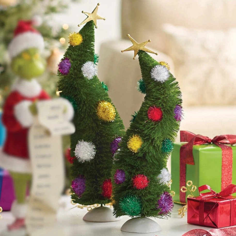 This whimsical green tree boasts a playful wonky design, curving like the letter S for a fun and festive touch! Decorated with bright Who-ville colored pom-poms as ornaments and topped with a shimmering gold star, it’s the perfect addition to a Grinch Village display or as a standalone accent piece. Bring a bit of Seussian magic to your holiday décor with this delightfully quirky tree!