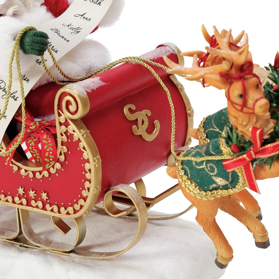Nothing is more magical than Santa in his traditional red and gold sleigh, led by eight of his finest reindeer on Christmas Eve. This stunning figurine captures the enchantment of that moment, making it a magnificent holiday centerpiece. Crafted from signature stiffened Clothtique fabric with hand-painted details, it brings the wonder of Santa’s journey to life!