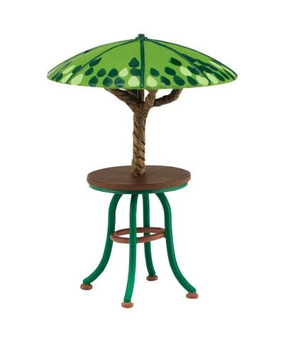 The Snow Village sidewalk brat stop is a charming outdoor fixture featuring a distinctive Black Forest umbrella, designed to resemble a lush green tree canopy. With its rustic wooden tabletop and sturdy frame, this cozy stop offers the perfect place to pause on the patio. Whether placed in a lively market scene or a quaint village corner, this delightful piece adds warmth, character, and a touch of European charm to your Snow Village display.